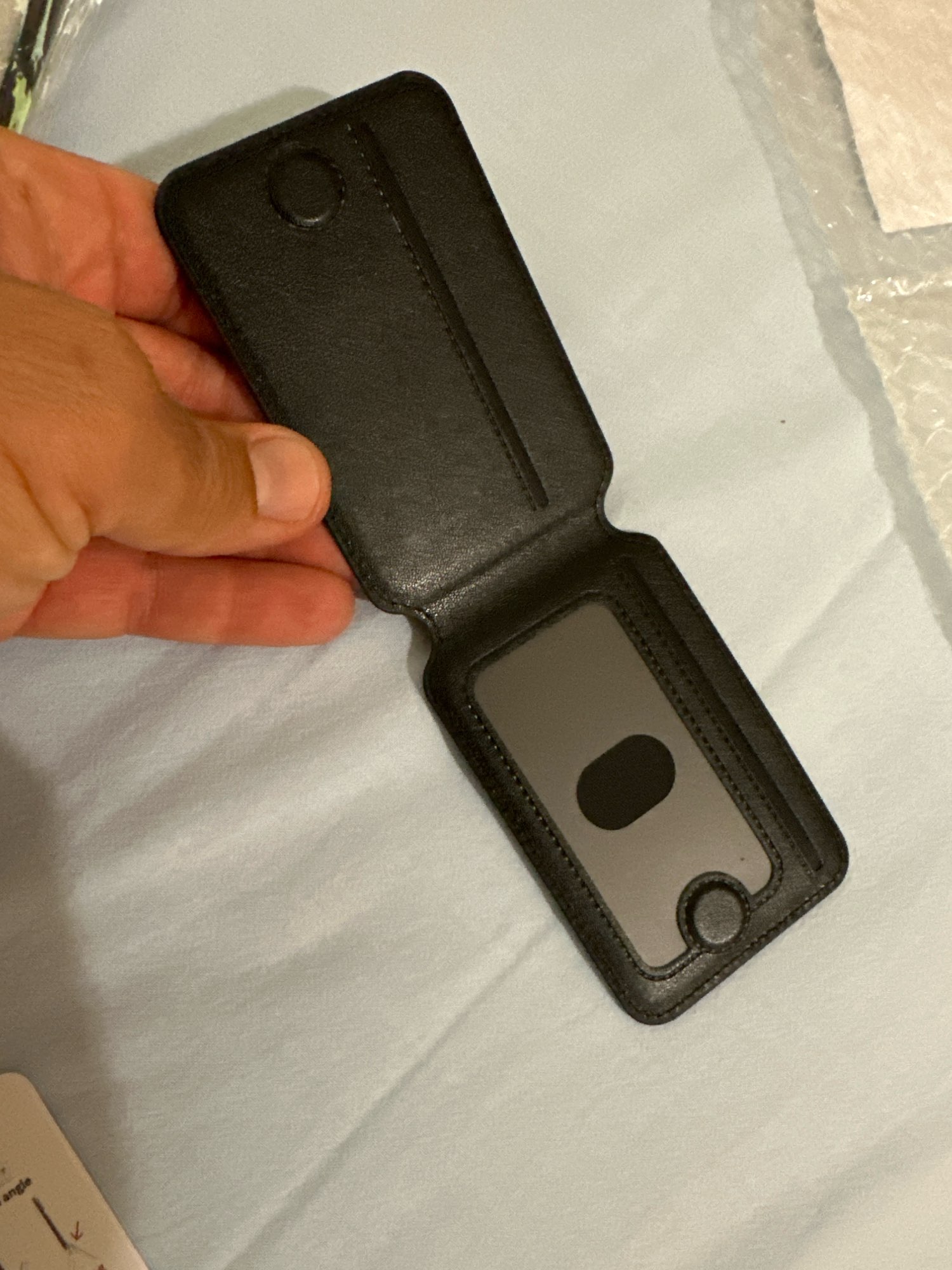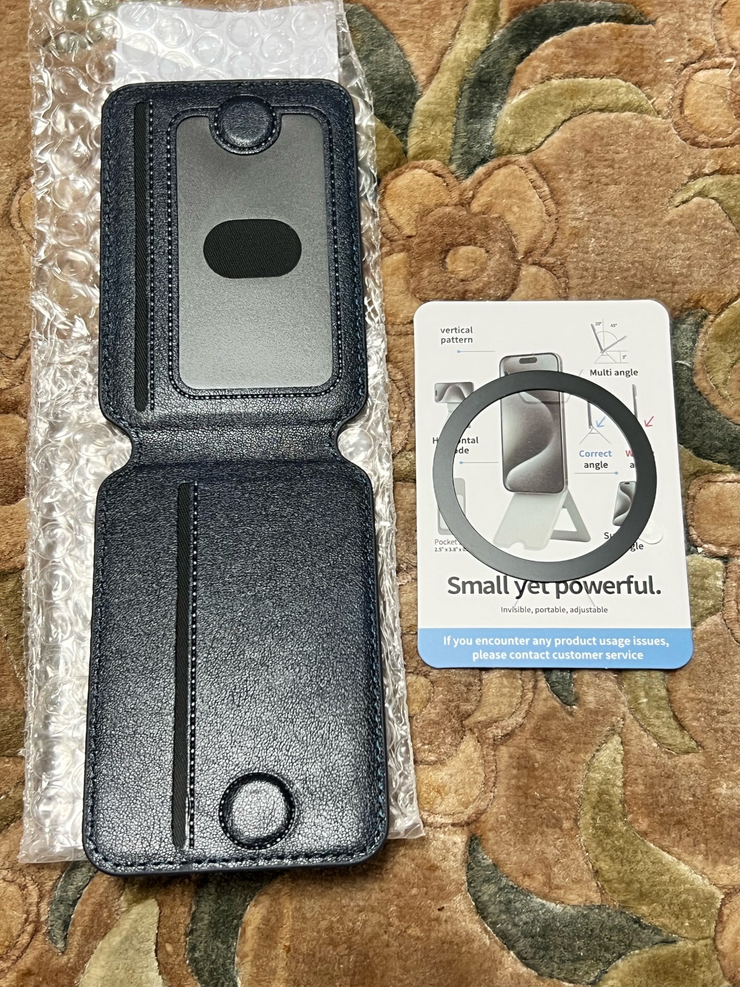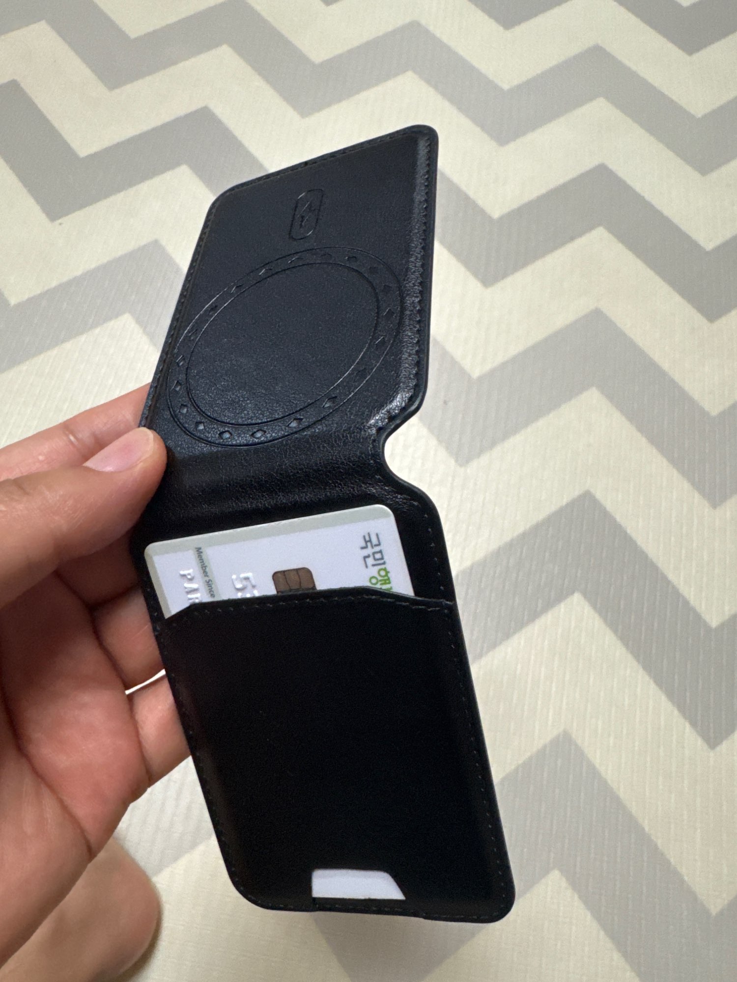 Vino con un manual extraño y un anillo MagSafe (de hierro), pero se adhiere bien incluso sin ellos. Tiene capacidad para tres tarjetas, pero si se estira durante el uso, ¿no sería posible que cabieran cuatro o cinco tarjetas? Por si acaso.