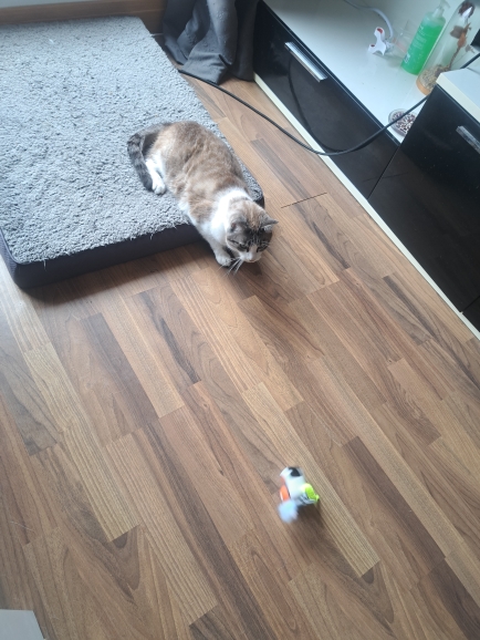 espectacular 👌 mi gato no se movía mucho y esta un poco gordito este juguete lo ha motivado por sus movimientos y lo mejor no depende el control remoto 100 % y cuando se gira y se voltea se pone en posición solo.. le he puesto una brida ya que a mi gato le encantan y esta como loco .jajajajja