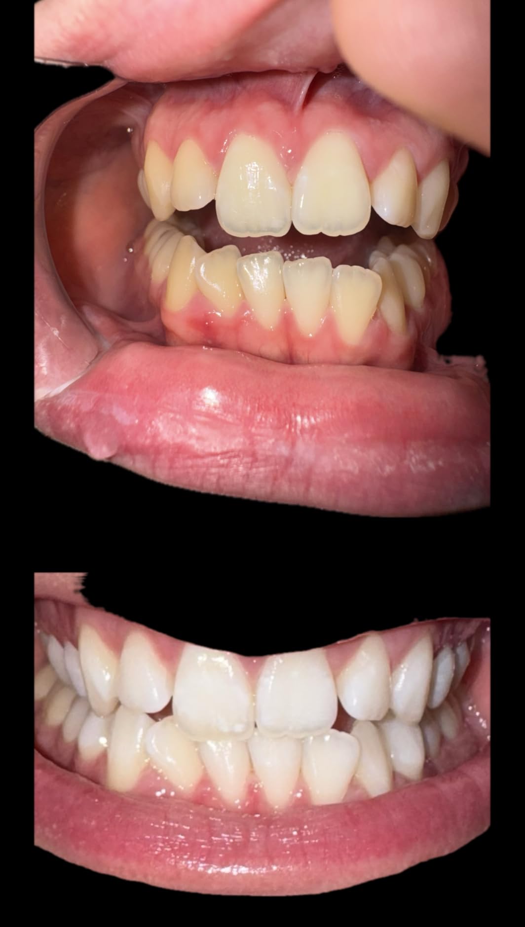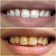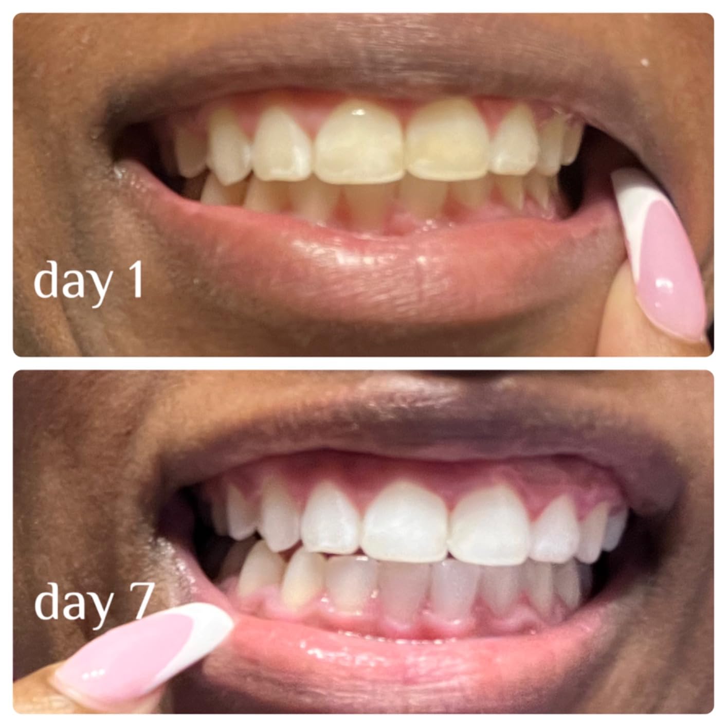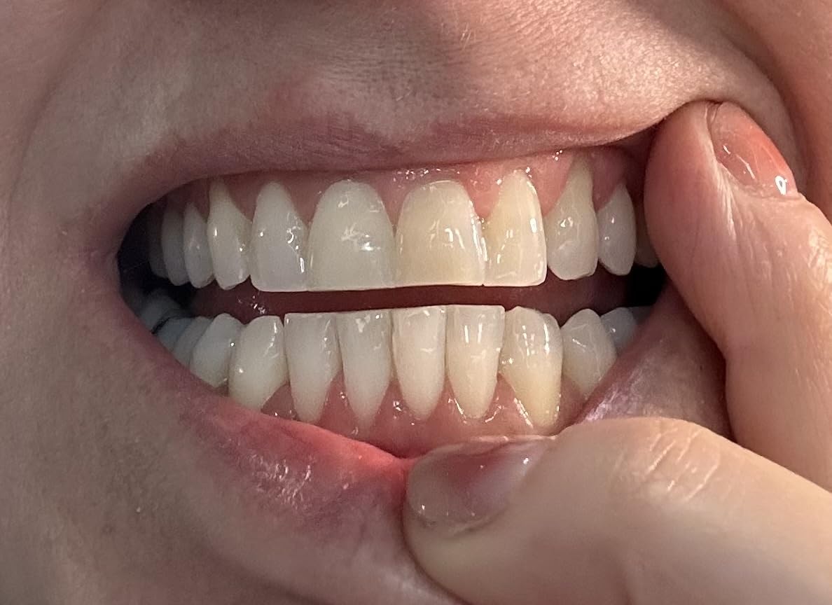 Sorprende a estos realmente funcionan. Sólo he usado unos 6 de ellos y no todos los días. Uso estos enjuagues bucales blanqueadores y pasta dental blanqueadora y el hombre realmente blanquea. No creo que necesitaré usar los 28 días completos. Es difícil contarlas de las fotos pero en la vida real es una gran diferencia. El que tienes los dedos es el anterior.