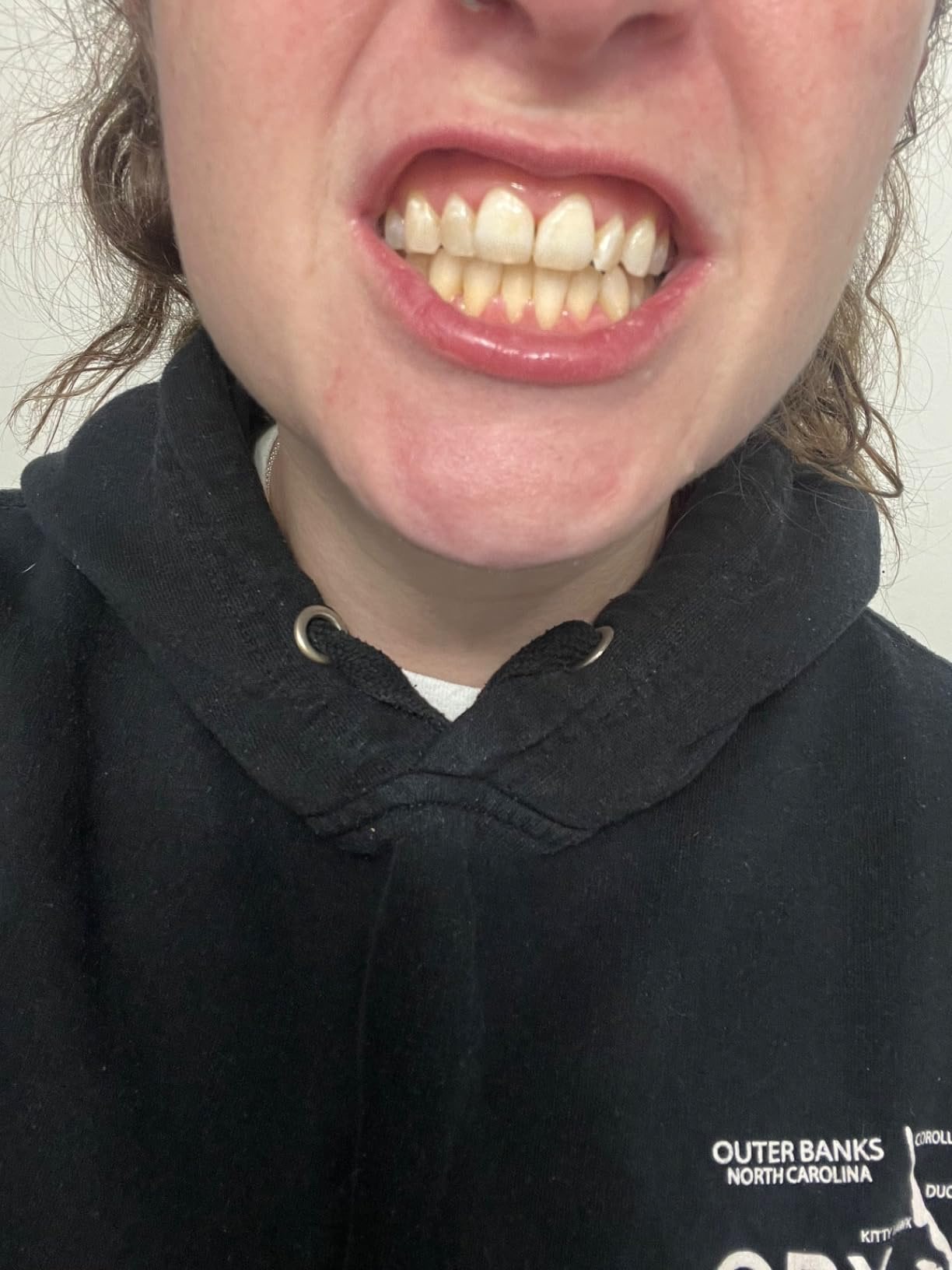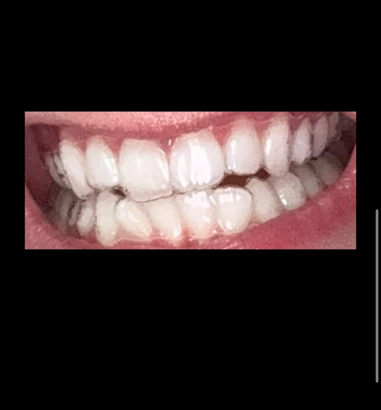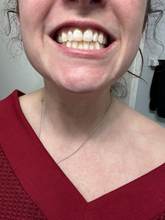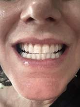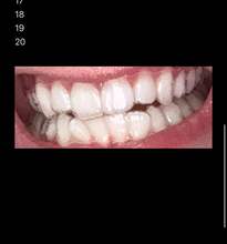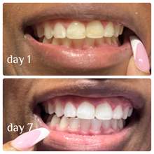 Esta imagen es exactamente una semana después y solo después de usar 5 de las 7 tiras. Usó las 5 tiras durante unos 30 minutos cada vez... aún no tenga pasta de dientes ni enjuague bucal, pero veendo qué tan bien usan estas tiras ¡Me vamos conseguir toda la línea! Necesito mucho trabajo de dientes hecho, ¡pero solo esta mejora es increíble! No lo dudes, comprar estos