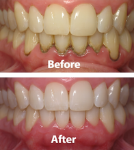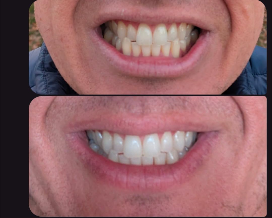 La primera foto es antes de empezar, la segunda es después de una semana de uso, sin retoque. Soy un ex ahumador y un adiito al café. ¡Definitivamente hizo que mis dientes luzcan mucho mejores!